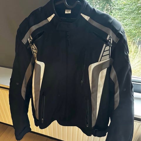 Roleff motorcykeljakke i størrelse L. Jakken er sort med grå og hvide refleksdetaljer på for- og bagside. Model med høj krave og frontlynlås. Flere udvendige lynlåslommer samt indvendige lommer. Foret som kan lynes af.
