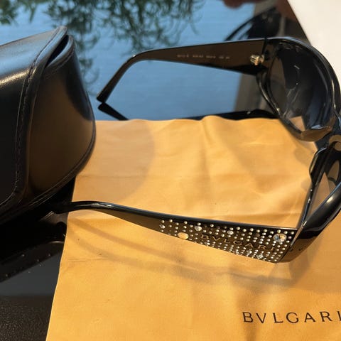 Versace solbriller til kvinde i sort. Modellen har kraftig, bred indfatning og mørke glas. Siderne er dekoreret med et markant geometrisk metalbeslag i guld-look. Brillen er fremstillet i Italien og leveres med original æske, etui og pudseklud, som ses på billederne.