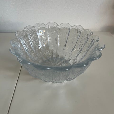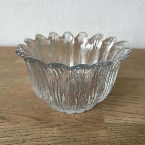 Skålen har bølget, blomsterformet kant og struktureret overflade i glasset.