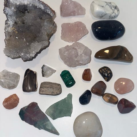 Jeg sælger en flot og varieret samling af krystaller, fosiller og sten, med over 60 stk i alt, ud over bunkerne med karneol og muslingeskaller.
