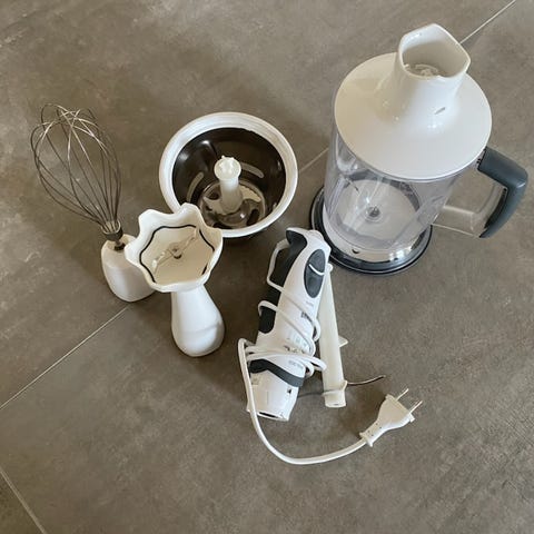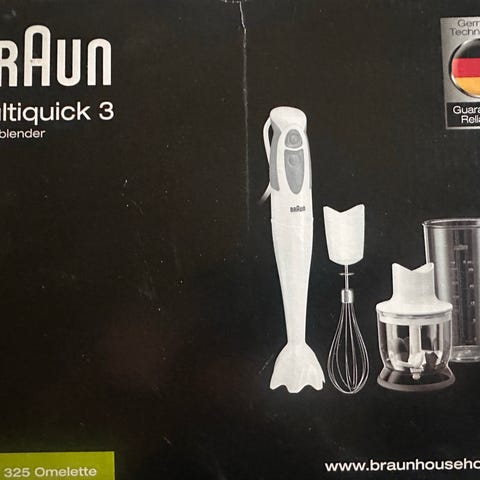 Braun MultiQuick 7 stavblender sæt. Model MQ 7075X med flere tilbehørsdele. Sættet indeholder stavblender, piskeris, hakker og bæger, som kan bruges til blendning, piskning og hakning af forskellige råvarer i køkkenet. Stavblenderen er beregnet til tilberedning af fx smoothies, supper, puré og saucer samt til hakning af mindre mængder kød, grøntsager eller nødder.