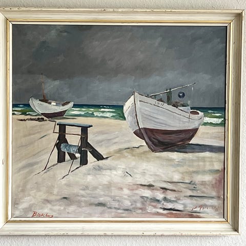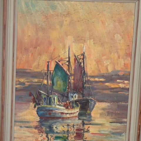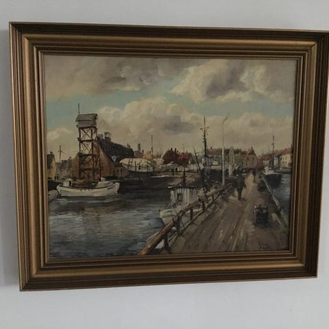 Maleri med havnemotiv, der viser både og skibe ved kaj. Billedet er udført i dæmpede, naturtro farver med fokus på himmel, vand og havnemiljø. Maleriet er indrammet i en bred, gylden ramme. Velegnet til ophængning i stue, kontor eller andre rum, hvor man ønsker et maritimt motiv på væggen. Mål på rammen er 60 gange 54 cm. Rammen har få afskalninger.