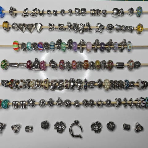 Lovelink charms i ægte sølv med detaljer i plast, unisex. Perlerne har forskellige mønstre og farver og er velegnede til brug på Pandora-armbånd eller -halskæder. Materialet er primært sølv kombineret med plastdekorationer. Egnet til både kvinder og mænd, afhængigt af stil og sammensætning.