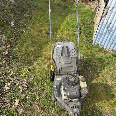 Garden benzinplæneklipper i sort og grøn med opsamler bagpå. Plæneklipperen har håndtag i metal med plastgreb og fire hjul. Den er egnet til klipning af almindelige græsplæner i have eller mindre grønne områder. Opsamlerposen bagpå samler det afklippede græs, så plænen efterlades ryddelig. Maskinen startes og betjenes fra håndtaget, og klippehøjden kan justeres ved hjulenes indstilling, afhængigt af model og konstruktion.