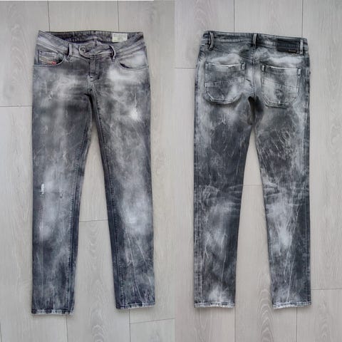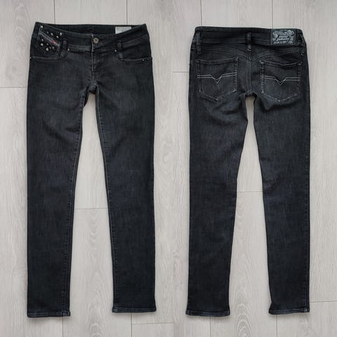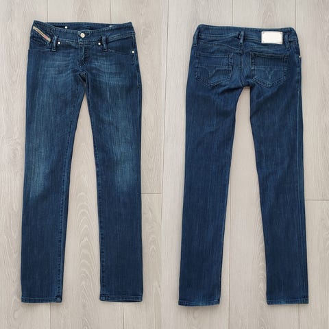 Diesel Ronhary jeans til damer i blå denim. Modellen er lavet i stretch-denim og har taljevidde W27 og størrelse S. Klassisk 5-lommet design med lynlås/gylp og bæltestropper. Velegnet som hverdagsbukser eller til afslappet brug.