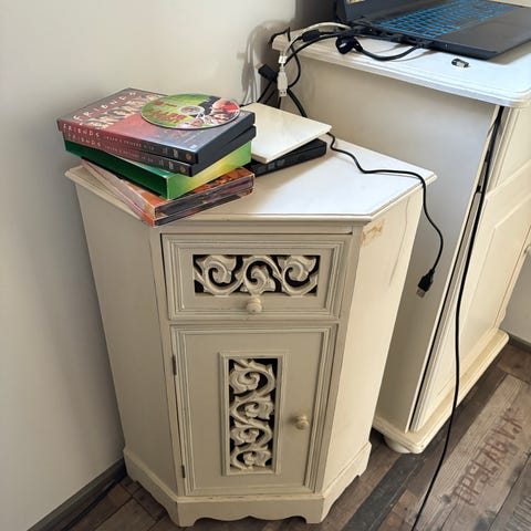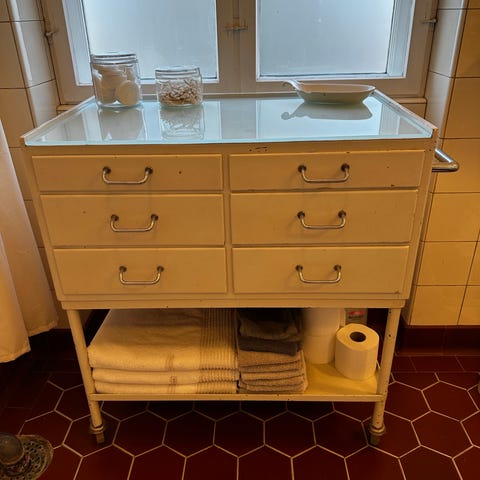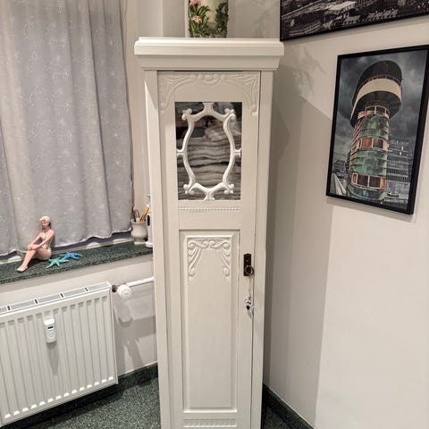 Hvid / creme farvet gammel fransk metal reol brugt som udstillings reol