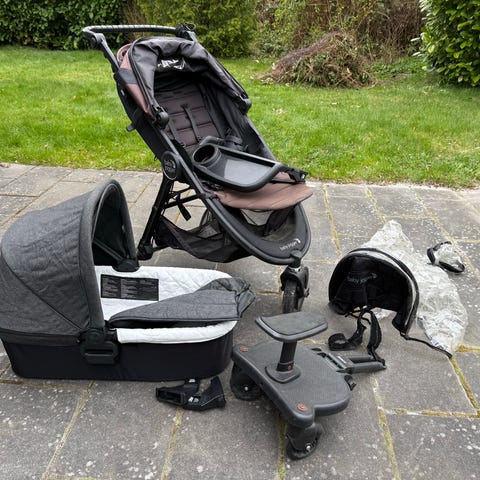 -Det er muligt at koble joggeren på en cykel, så den trækkes efter den i en stang.
