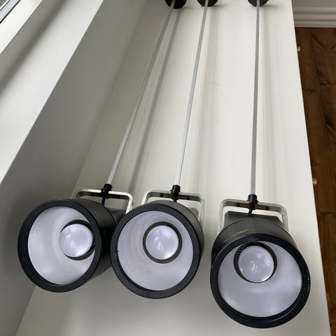 2 stk. sorte storebror lamper fra Louis Poulsen, fra 1970érne. Kan hænge fra loft, i loft og, på væg og stå på gulv. Lidt patina.