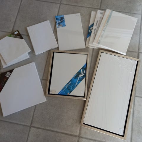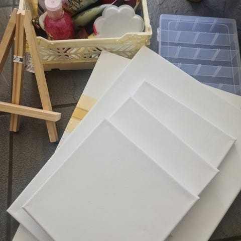 Sæt bestående af hvidt malerlærred som er monteret på en træramme.