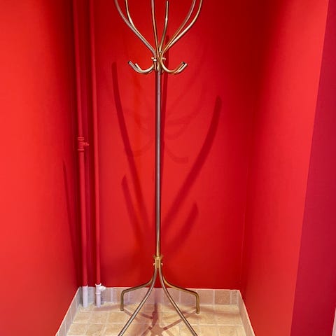 Stumtjener med frakkekroge, højde 1700 mm, ø 450 mm, 8 frakkekroge. Smuk og funktionel. Solid og robust stumtjener. Rør og kroge af pulverlakeret stål. Med paraplyholder. Stabil vha. tung fod med stenfyld.