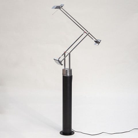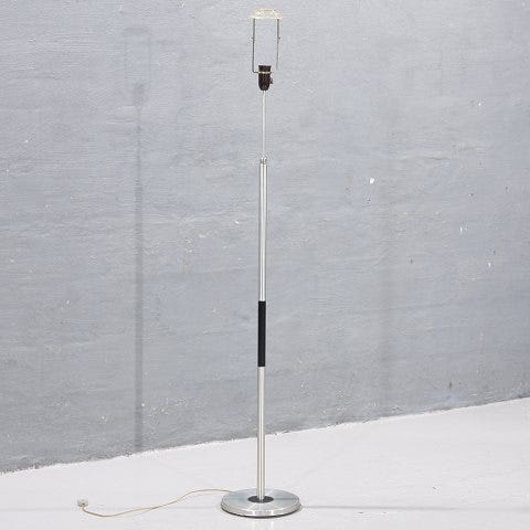 Gulvlampe med stamme og højdejusterbar arm af forkromet stål. Rund bas af mahogni. Design: Taller Uno Kay P