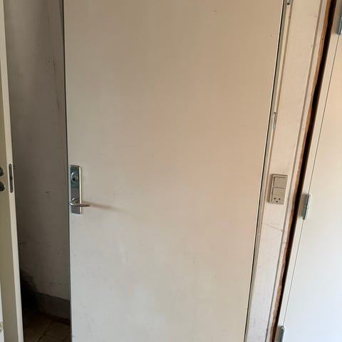 Bryggersdør i hvid overflade med tilhørende karm og dørgreb. Karmmål på 206x93 cm