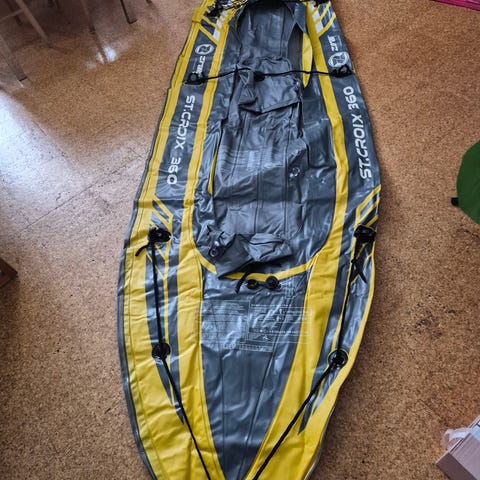 Oppustelig paddleboard i blå farve med grå kanter. Materialet fremstår som kraftig PVC eller lignende, der kan pumpes op før brug og tømmes for luft efter brug for nem opbevaring og transport. Pumpe og padle følger med. Mål: 3,60 m x 80 cm.