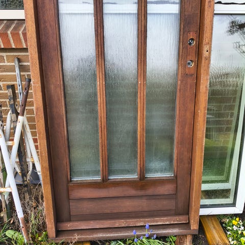 Døren har tre glasfelter samt et fastfelt øverst i karmen, og sidepartiet består af et stort fast glasfelt og et tilsvarende øverst som dørkarmen.