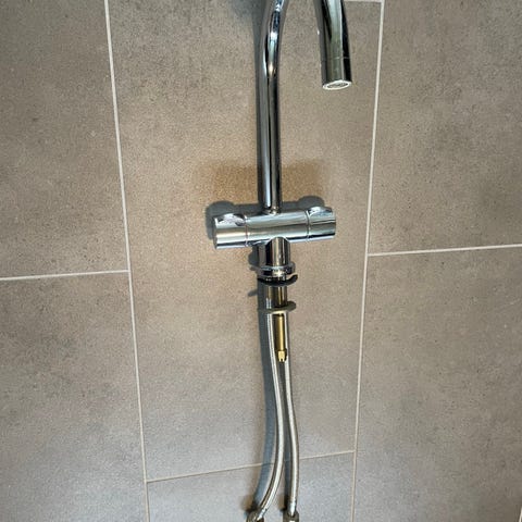 Grohe blue home danskvandsmaskine med mono armatur i rustfri stål. Armaturet fungerer fint, men maskinen har en vandlæk. Den skal repareres, som evt. kan gøres hos Watertrade. Maskinen er blevet renset og har helt nyt filter.