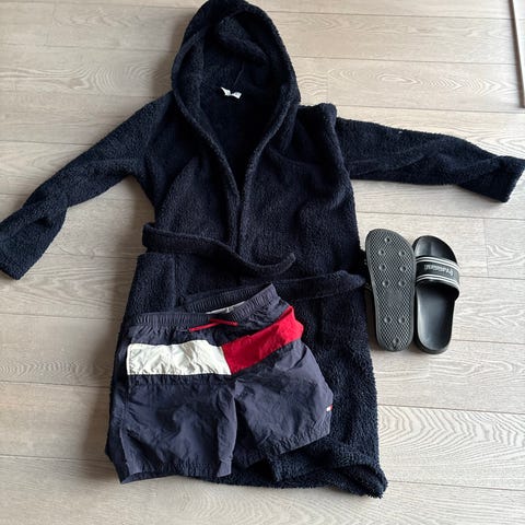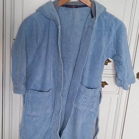 Badekåbe, str L / str 152-164 cm. Mørkeblå - farven er klar og meget mørkeblå. Fotos er misvisende, da mit kamera er dårlig til at gengive blålige nuancer. Især nærbillederne er misvisende, da farven ser grålig og forvasket ud. Den er ikke forvasket. Den er som ny. Brugt meget lidt og vasket 3 gange. Nypris 549,-