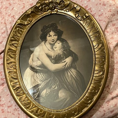 Antikt Billede af lyttende hofdame i kjole indrammet litografi