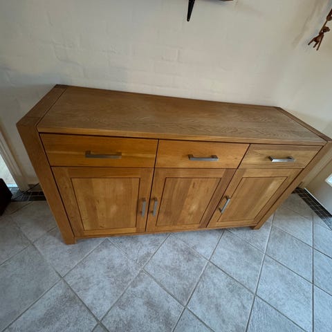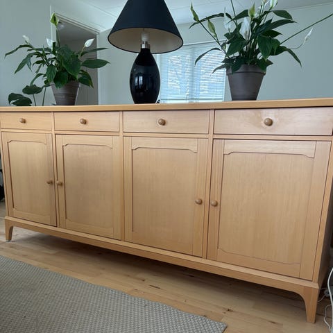 Skænk i træ med fire låger. Skænken står på ben og har et enkelt, rektangulært design. Overfladen fremstår i en naturlig træfarve. Velegnet til opbevaring i stue, spisestue eller entré, hvor der er behov for skjult opbevaringsplads bag lågerne og en plan overflade til placering af fx tv, lamper eller dekoration.