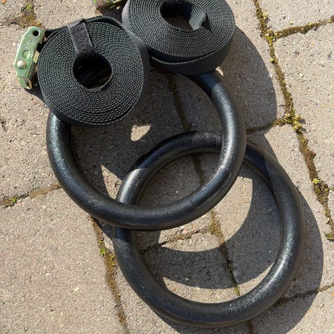 Gymnastikringe i træ med tilhørende ophængsbeslag. Sættet består af to træ-ringe med reb samt metalbeslag og kroge til montering i loft eller stativ. Velegnet til indendørs brug i børneværelse eller lignende, hvor der er mulighed for sikker fastgørelse i loft eller bjælke. Gymnastikringe kan anvendes til leg og simple gymnastikøvelser for børn.