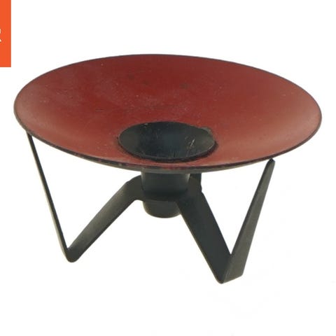 Denne metal lysestage har en skålformet top i rød farve med en sort midtersektion til at holde stearinlyset. Basen har tre ben for stabilitet. Diameteren er 9 cm, hvilket gør den kompakt og ideel til mindre lys.