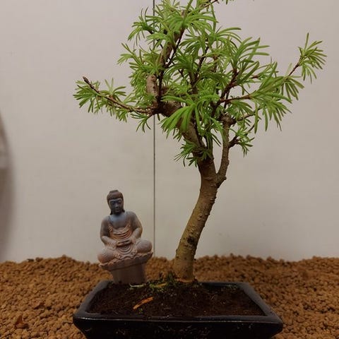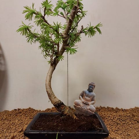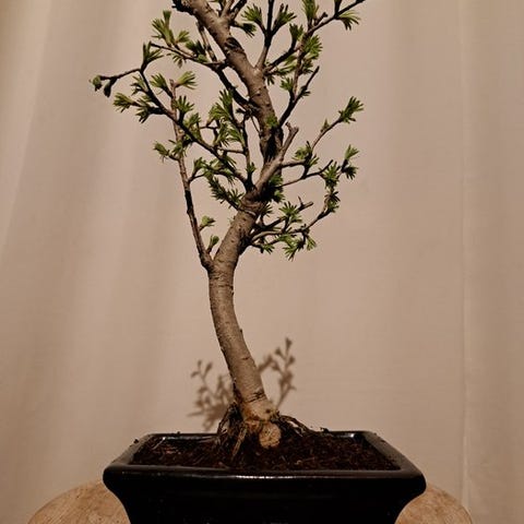 De Larix bonsai er en ganske særegen skikkelse: en af de få nåletræer, der mister sine nåle om efteråret. I foråret friskgrøn, i efteråret gylden og i vinteren et råt silhuet – denne bonsai lever virkelig med årstiderne. Dens robuste stamme og fine nåle gør den til et kraftfuldt miniature af naturen.