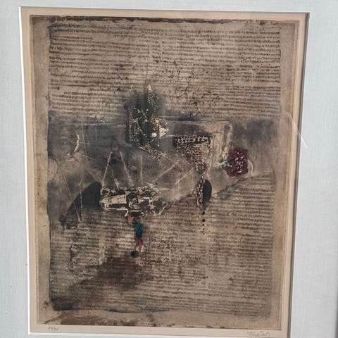 Et sjældent og levende originalværk af den afdøde amerikanske kunstner Fred Babb, berømt for sin neo-ekspressionistiske stil og sine inspirerende budskaber. Det er ikke en standard fladtrykt plakat, men en vintage "Art-to-Wear"-T-shirt professionelt monteret i sin ikoniske røde ramme.