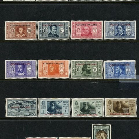 Avanceret samling af nogle italienske kolonier med nogle vigtige serier, hvor tilstanden på visse værdier bør kontrolleres, få et indtryk gennem billederne (alle katalogets sider vist), samlet set i en binder i god stand.