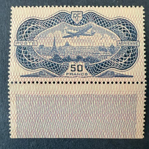 Fransk oprindelse, frimærke med titel Cote 1500€, poste aérienne, 50Frs burelé, katalogiseret som Yvert PA n°15, ubrugt uden gummi. Klik på den blå "gå til varen" knap, for at købe eller byde på denne vare. Den samlede pris vil blive vist inden du afgiver dit bud.