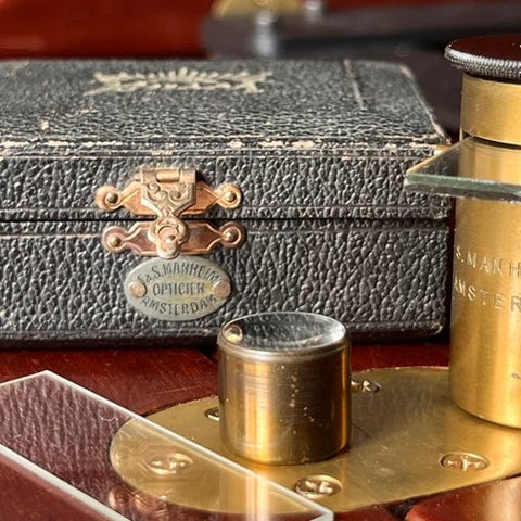 Elegant lommekølesmikroskop i messing, dateret omkring 1890.