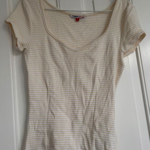 Esprit T-shirt til kvinder i størrelse M. T-shirten er hvid med tynde, vandrette striber og er fremstillet i bomuld. Modellen har korte, let løstsiddende ærmer og rund hals. Velegnet til hverdagsbrug og kan bruges alene eller under en trøje eller jakke.