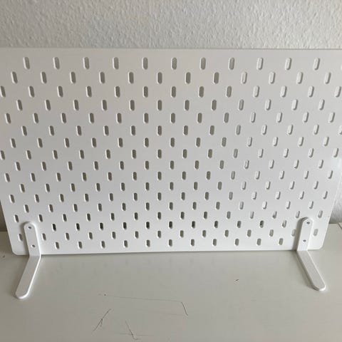 Perforeret træplade egnet til brug som reol- eller opbevaringsplade. Pladen har aflange gennemgående huller i et regelmæssigt mønster, som kan bruges til ophæng eller ventilation. Velegnet til værksted, skur, garderobe eller andre opbevaringsløsninger, hvor der ønskes mulighed for at montere kroge eller beslag på pladen.
