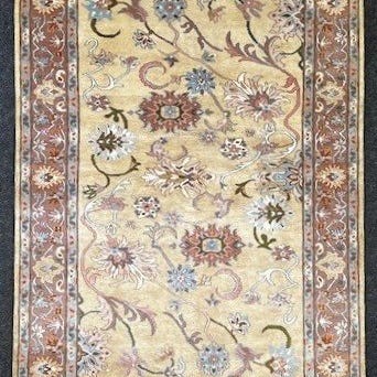 Begge tæpper er stilistisk perfekt afstemt og viser et fint udarbejdet samspil af blomsterornamenter, svungne ranker og et centralt medaillon. De lyse felter i kombination med varme beige-, blå- og rosatoner giver tæpperne en rolig, ædel udstråling.