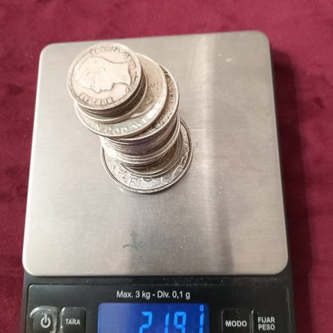 Købet består af 1009 gram sølvmønter med 0,500 fineness, fra forskellige nominel og datoer; forsendelsen er omhyggeligt indpakket og sporbar. Klik på den blå "gå til varen" knap, for at købe eller byde på denne vare. Den samlede pris vil blive vist inden du afgiver dit bud.