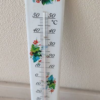 Termometeret er i god vintage stand med lette brugsspor i betragtning af alderen. Emaljen har stadig en smuk glans og farverne er friske. Tallene på plasten (til aflæsning af temperaturen) er