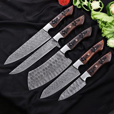 Tilpasset håndlavet rustfrit stål (12C27) 5-delt sæt køkkenknive med resin-håndtag og læderslire (rullepose)