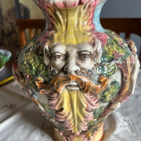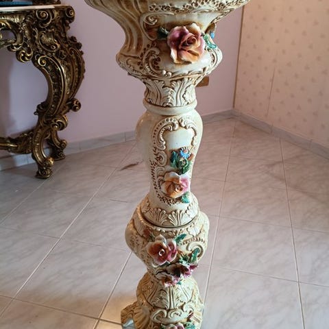 Stil og oprindelse: Capodimonte-porcelæn af kunstnerisk karakter, oprindelig fra Napoli-området. Stilarten er straks genkendelig på de rige og udsmykkede detaljer.