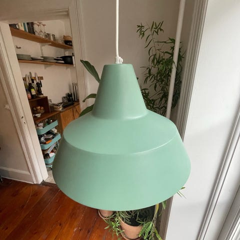 Sælger denne fine pendel lampe i pastel grøn farve med messing detalje. Kan afhentes i Frederikssund eller leveres mod betaling.