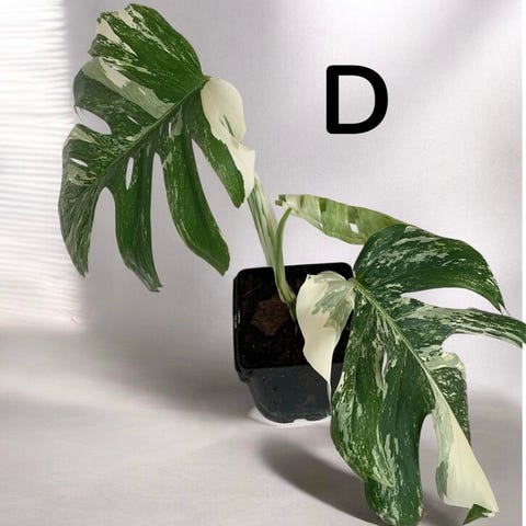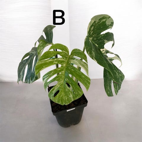 Monstera variegata stueplante med grøn-hvide marmorerede blade. Planten har karakteristiske, fligede blade med varierende mængde hvid variegering. Etablerede topskudaflægge. Står i Korsør eller kan sendes på købers regning og ansvar .