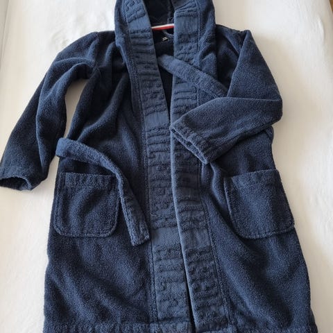En marineblå badekåbe med hætte og bælte. Den har lange ærmer og lommer på forsiden. Materialet ser blødt og behageligt ud, hvilket gør den ideel til afslapning.