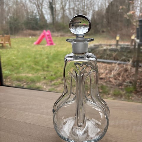 En hvid keramik karaffel med et tryk af Johnnie Walker Red Label Old Scotch Whisky. Den er rektangulær i form med en bred tud og et solidt håndtag. På forsiden er der et stort whisky-mærkat samt et ikonisk billede af en gående mand i rød jakke og hat. Bunden har et mærke fra producenten, potin. Størrelsen er 16,5 cm i højde.