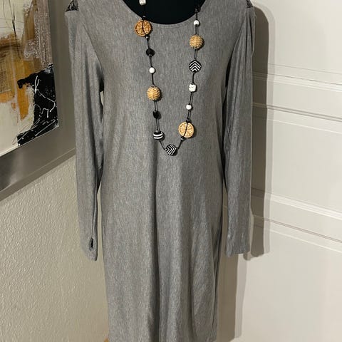 Den har krave, knaplukning foran øverst og lange ærmer. Har læg i ryggen. Kjolen har skrå forlommer og en løs, lige pasform, der går til omkring knæet
