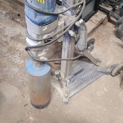 Kerneboremaskine til våd/tør boring med tilhørende stor diamantborekrone. Borekronen har en længde på 35 cm og en diameter på 10 cm. Udstyret er egnet til kerneboring i beton, murværk eller lignende materialer, hvor der er behov for præcise, cylindriske huller. Maskinen leveres med kabel og håndtag som vist på billederne.