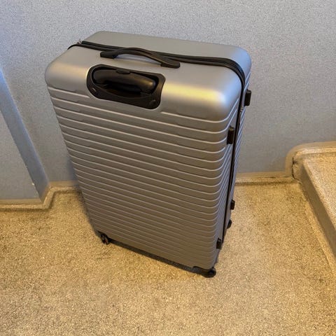 Den store kuffert har fire hjul og kan både skubbes og trækkes