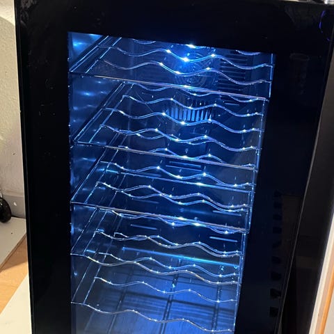 Træhylder. Nederste hylde har lidt rødvinspletter.