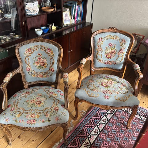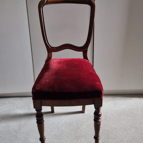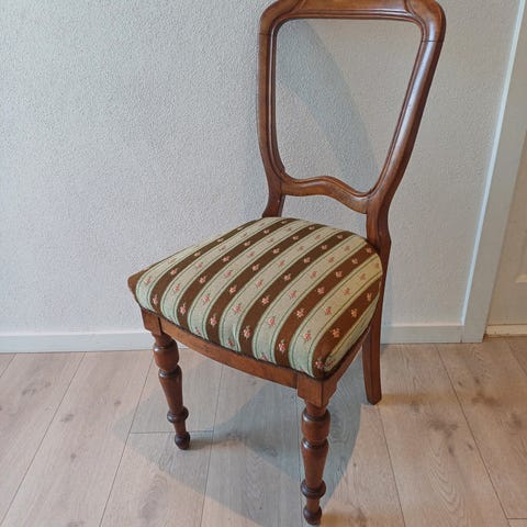 "Rokoko"stol i ukendt træsort. Betræk på sæde er beskadiget.