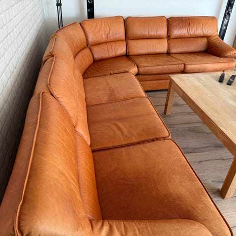 Sort hjørnesofa i læder med tilhørende puf. Sofaen har høje nakkestøtter og brede armlæn. Den er polstret med glat læder på både sæder, ryg og sider. Hjørneopstillingen giver flere siddepladser og egner sig til stue eller opholdsrum. Puffen er betrukket med samme sorte læder og kan bruges som ekstra siddeplads eller fodskammel.