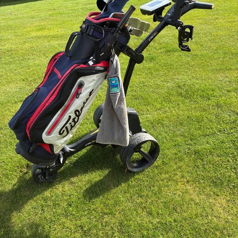 El-golfvogn med 3 hjul i sort. Meget lidt brugt. El-golfvognen har styrkonsol med display og betjeningsknapper placeret ved håndtaget. Drevet af el-motor med tilslutning til batteri.