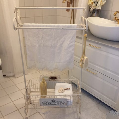 Håndklædestativ i metal i brun farve. Stativet har flere tværstænger til ophæng af håndklæder eller tekstiler og dekorative detaljer i smedejernslook. Egnet til brug på badeværelset eller i soveværelset til opbevaring og tørring af håndklæder eller plaider.