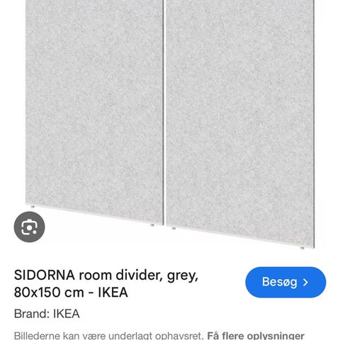 IKEA bordskærm med integreret skrivebord i hvid og grå. Bordet har en indbygget afskærmning i filt-lignende materiale, som omslutter arbejdspladsen på tre sider. Stellet er i metal med slanke ben, og bordpladen er rektangulær. Der er integreret kabeludtag og stikdåse på bordpladen, så lamper og elektroniske enheder kan tilsluttes direkte ved arbejdspladsen. Velegnet som enkeltstående arbejdsplads i hjemmet eller på kontor, hvor der er behov for afskærmning og koncentration. Dimensionerne fremgår af tegningen på billederne med højde, bredde og dybde angivet.
