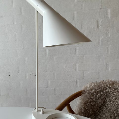 AJ lampen er designet i 1957 til SAS Royal Hotel i København og er et ikonisk design af Arne Jacobsen. Designet er grafisk og rent i sit udtryk, hvilket giver et tidløst look, der passer ind i forskellige farvepaletter, som er afstemt med moderne indretningstrends. AJ bordlampen giver nedadrettet lys, og skærmens vinkel kan justeres, så den passer til brugerens behov. Farven er malet hvid på indersiden, hvilket giver et ensartet, blødt lys.